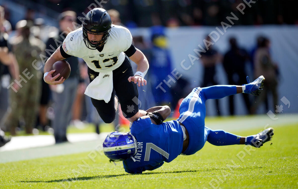 Army quarterback Bryson Daily, left, is tripped up after a short gain by Air Force safety Trey Taylor in the first half of an NCAA college football game Saturday, Nov. 4, 2023, in Denver. (AP Photo/David Zalubowski)