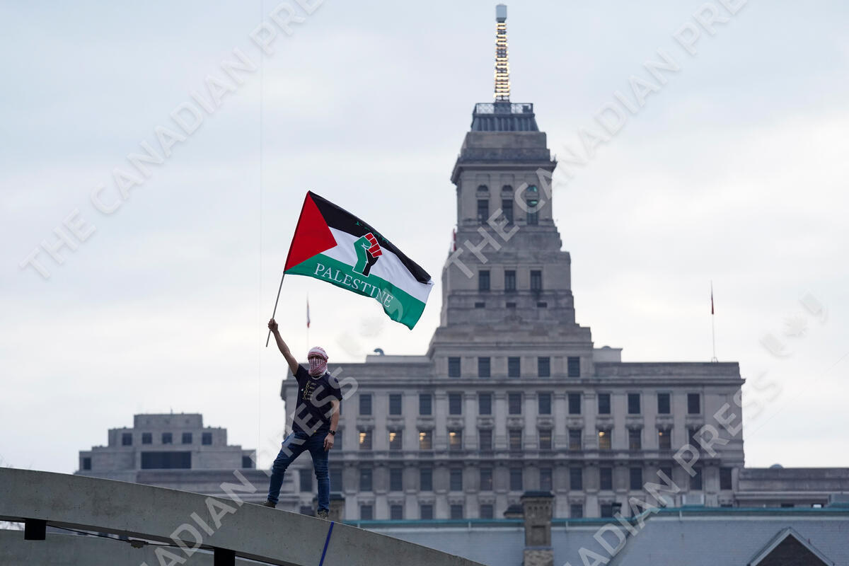 A protester waves a flag from on top of an arch at Nathan Phillips Square during a march for Gaza rally in support of Palestine in Toronto, on Saturday, Nov. 4, 2023.THE CANADIAN PRESS/Arlyn McAdorey