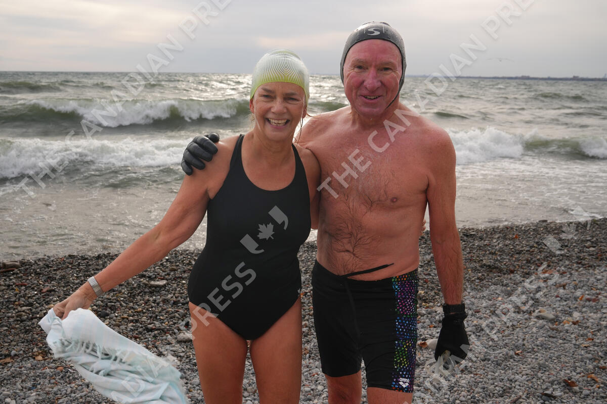 Jill Markvorsen and Dan Bowman, members of SwimOP (Swim at Ontario Place) pose for a photo after a swim in Lake Ontario off the west beach at Ontario Place in Toronto, on Friday, November 3, 2023. The group advocate to keep the beach accessible to all year round and oppose the redevelopment of Ontario Place by the Ford Government, which includes a long-term lease on the site's West Island for Austria-based company Therme to build a sprawling, private indoor water park and spa. THE CANADIAN PRESS/Chris Young
