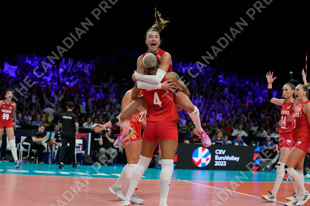 Team of Turkey celebrates a point during the Women's European Volleyball Championship final match between Serbia and Turkey in Brussels, Belgium, Sunday, Sept. 3, 2023. (AP Photo/Virginia Mayo)