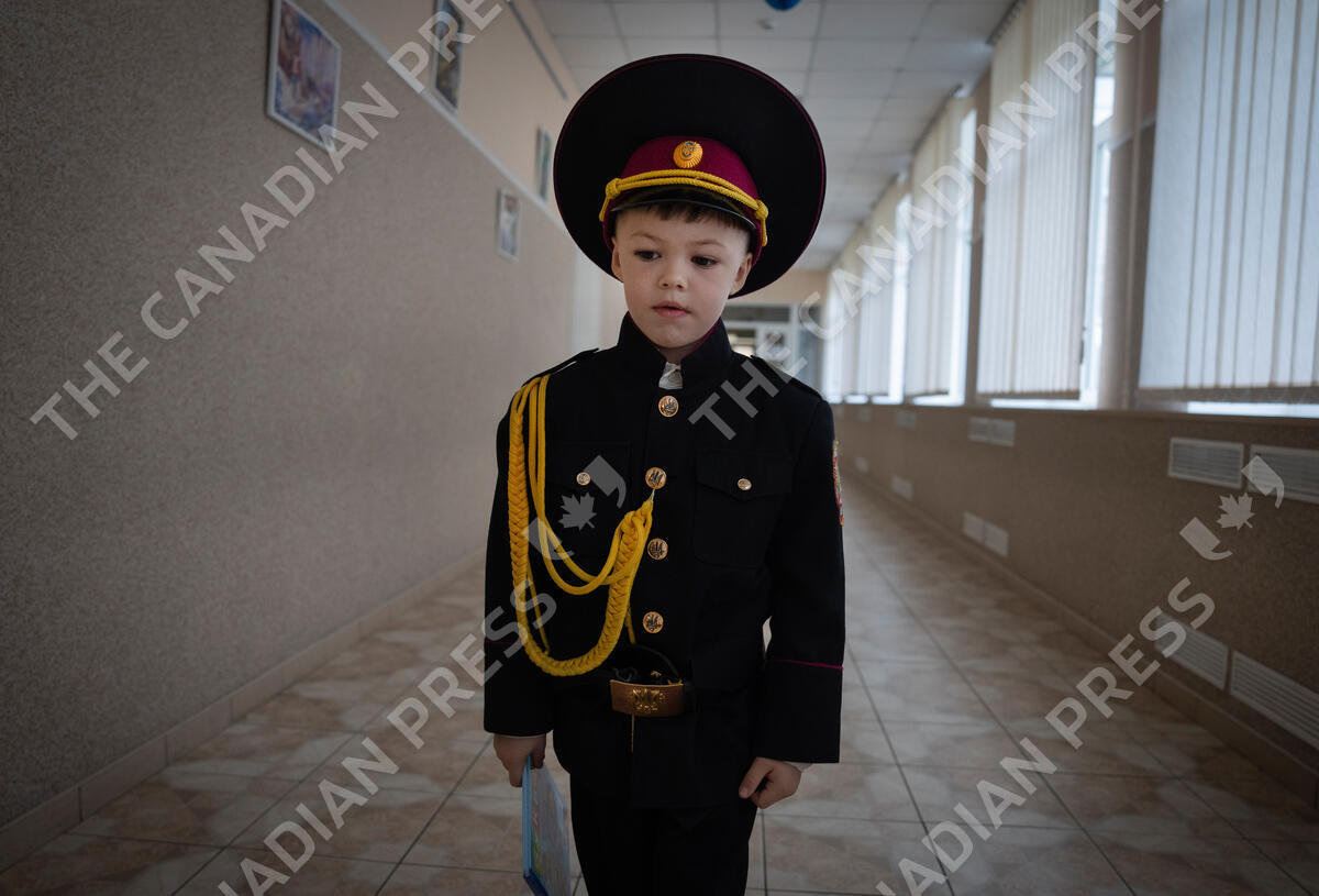 A young cadet goes to his first lesson on the first day of school at a cadet lyceum in Kyiv, Ukraine, Monday, Sept. 4, 2023. (AP Photo/Efrem Lukatsky)