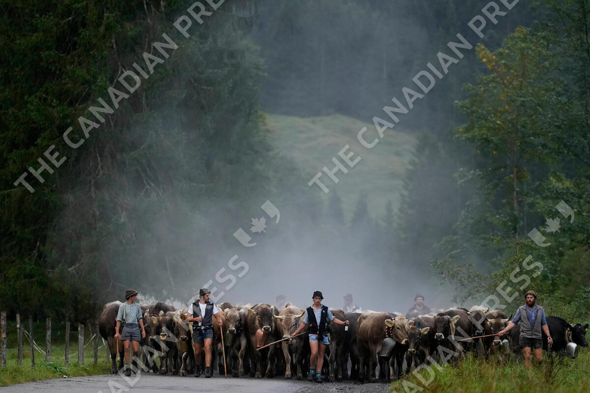 Bavarian herdsmen drive their beasts on a road during the return of the cattle from the summer pastures in the mountains near Oberstdorf, Germany, Wednesday, Sept. 13, 2023. (AP Photo/Matthias Schrader)