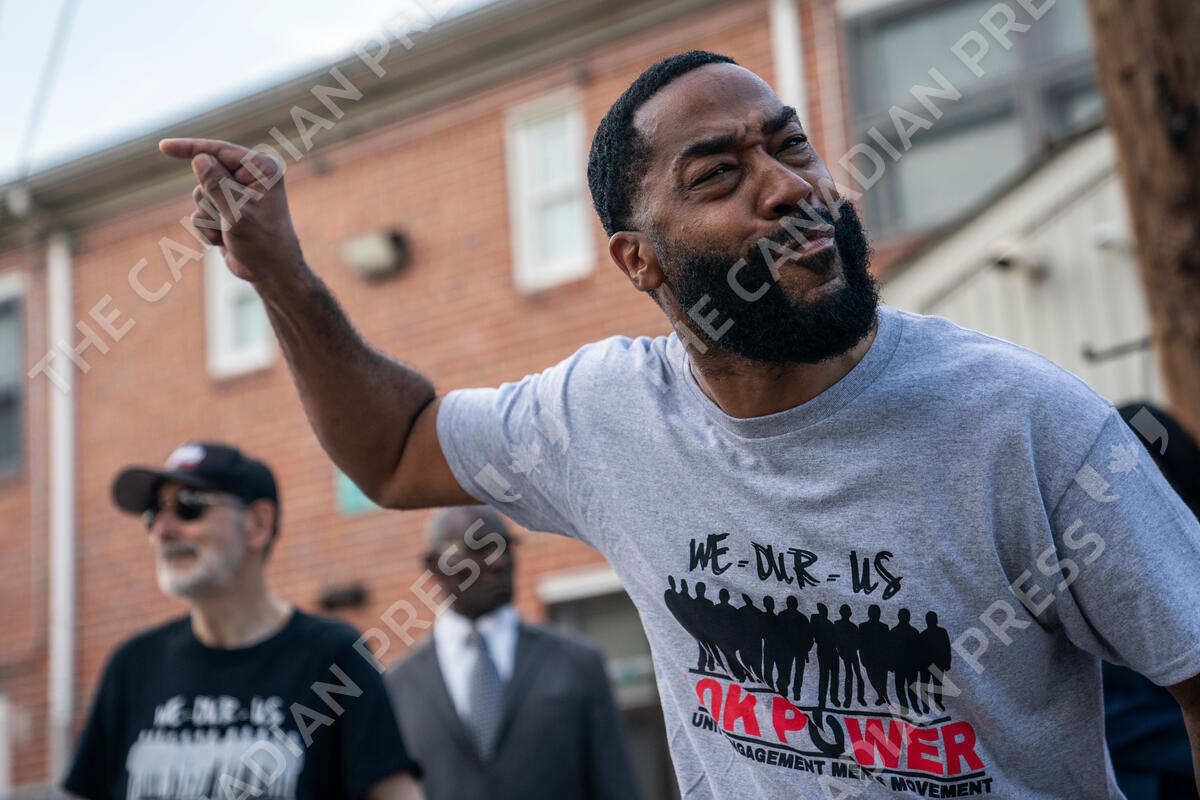 Rev. Shawn Freeman speaks during a prayer gathering at the site of Sunday's mass shooting in the Southern District of Baltimore, Monday, July 3, 2023. (AP Photo/Nathan Howard)