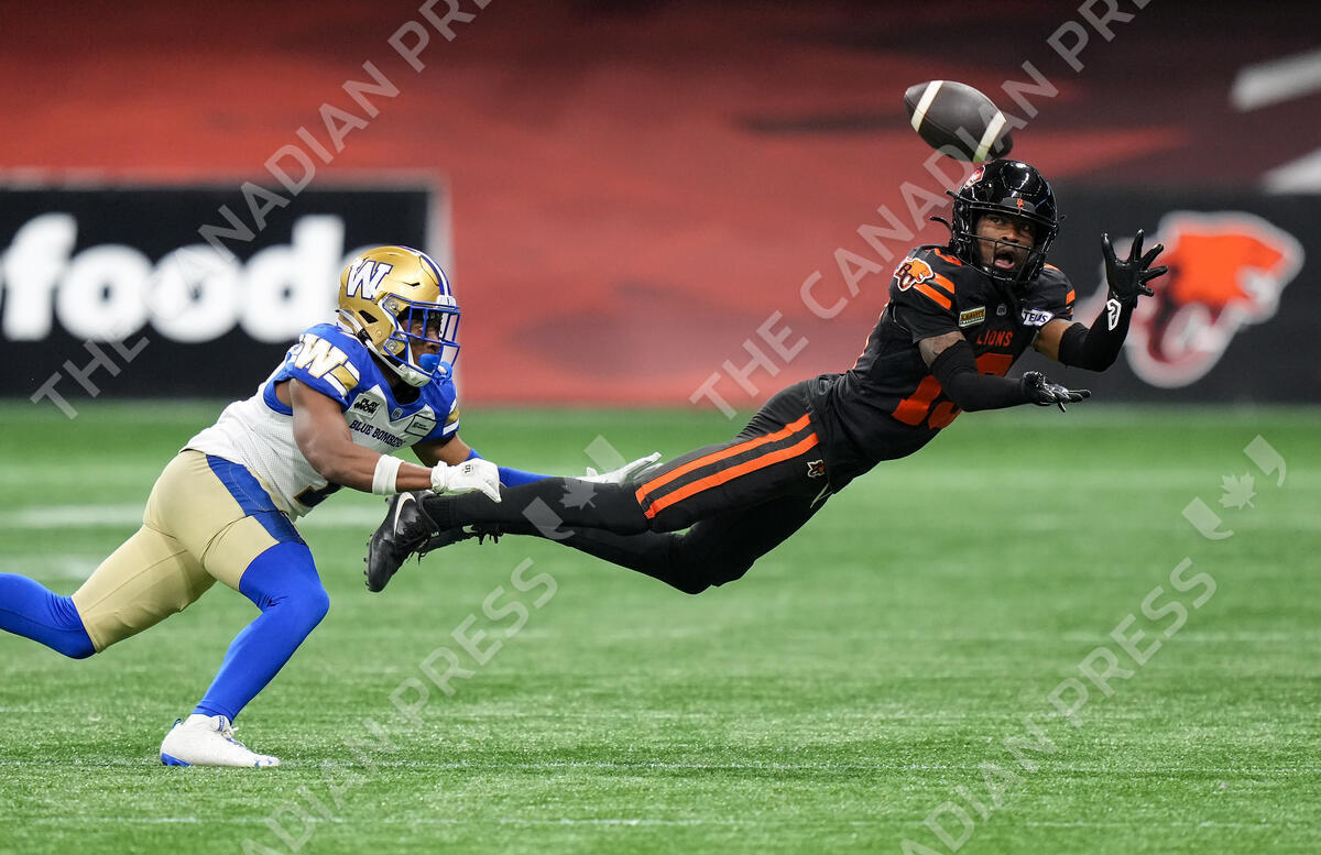 B.C. Lions' Alexander Hollins, right, makes a diving reception as Winnipeg Blue Bombers' Jamal Parker defends during the first half of a CFL football game, in Vancouver, on Friday, October 6, 2023. THE CANADIAN PRESS/Darryl Dyck