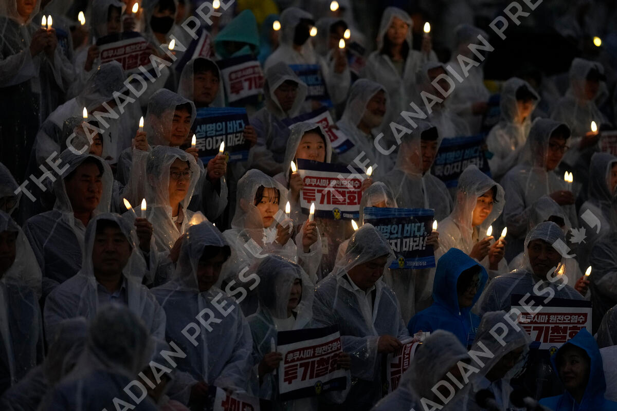 South Korea's main opposition Democratic Party members and supporters hold electronic candles during a rally to demand the withdrawal of the Japanese government's decision to release treated radioactive water into the sea from the damaged Fukushima nuclear power plant, in Seoul, South Korea, Wednesday, Aug. 23, 2023. (AP Photo/Lee Jin-man)