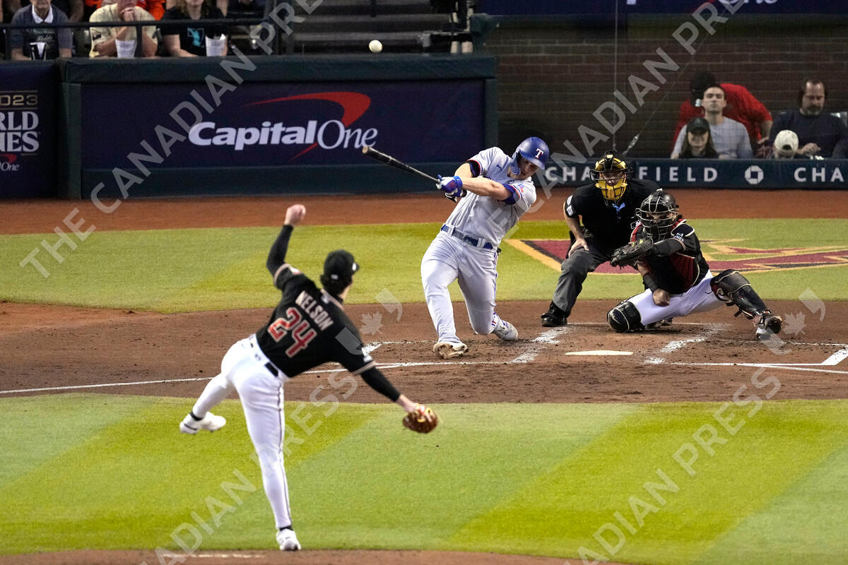 Texas Rangers' Corey Seager, center, hits a two-run home run off Arizona Diamondbacks relief pitcher Kyle Nelson (24) during the second inning in Game 4 of the baseball World Series Tuesday, Oct. 31, 2023, in Phoenix. (AP Photo/Ross D. Franklin)