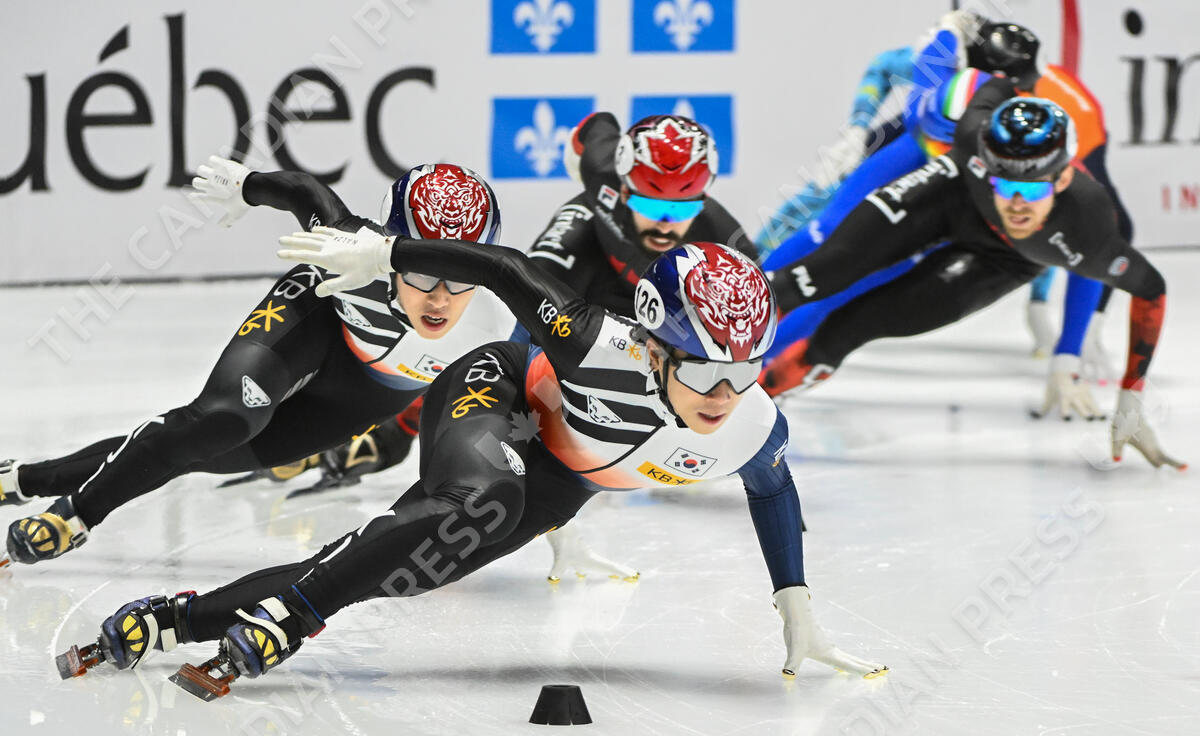 Kim Gun Woo of South Korea (126) skates to a first place finish ahead of the pack during the 1500-metre final race at the World Cup Short Track Speedskating event in Montreal, Sunday, Oct. 29, 2023. THE CANADIAN PRESS/Graham Hughes