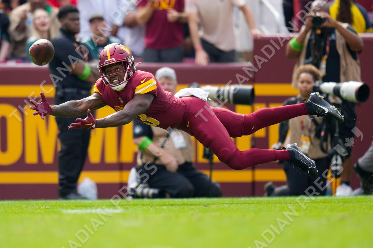Washington Commanders wide receiver Byron Pringle (3) leaping in an attempt to make a catch during the first half of an NFL football game against the Philadelphia Eagles, Sunday, Oct. 29, 2023, in Landover, Md. (AP Photo/Alex Brandon)