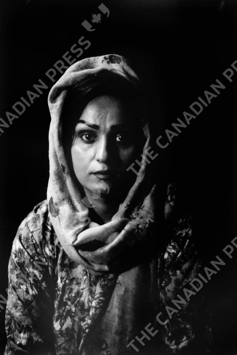 Zohreh, 26, poses for a portrait during a break from working in a carpet factory in Kabul, Afghanistan, Monday, May 29, 2023. Zohreh cooks for the workers at the facility. When her husband was a soldier, he was shot and injured in the war with the Taliban and cannot work, so she has to support the family, which includes four children. (AP Photo/Rodrigo Abd)