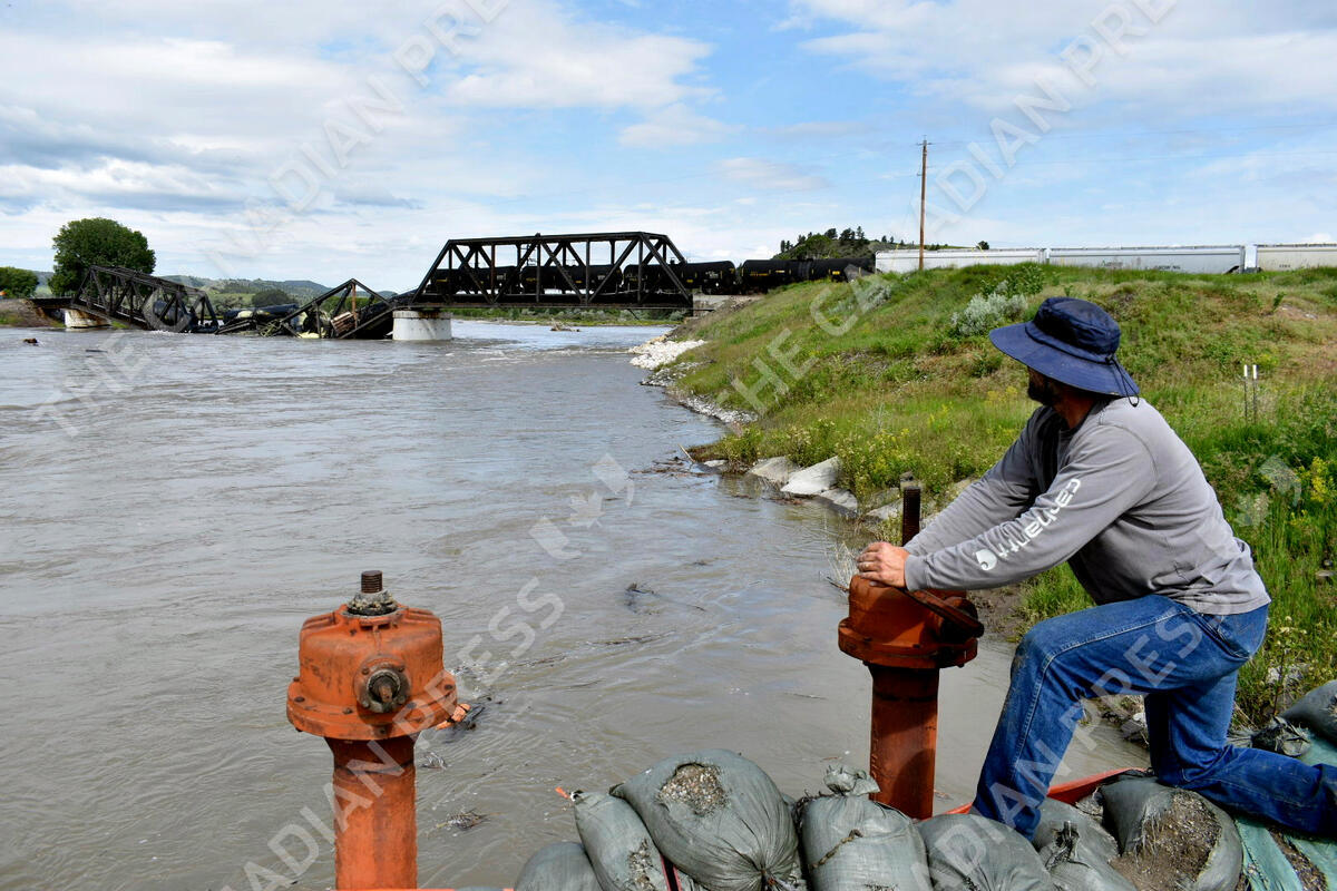 Kelly Hitchcock closes an irrigation ditch just downriver from a bridge collapse at the Yellowstone River near Columbus, Mont., on Saturday, June 24, 2023. The bridge collapsed overnight, causing a train that was traveling over it to plunge into the water below. (AP Photo/Matthew Brown)