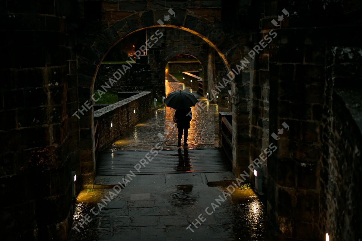 Pedestrian shelters under an umbrella as the rain falls on an autumn evening, in Pamplona, northern Spain, Tuesday, Nov. 21, 2023. (AP Photo/Alvaro Barrientos)