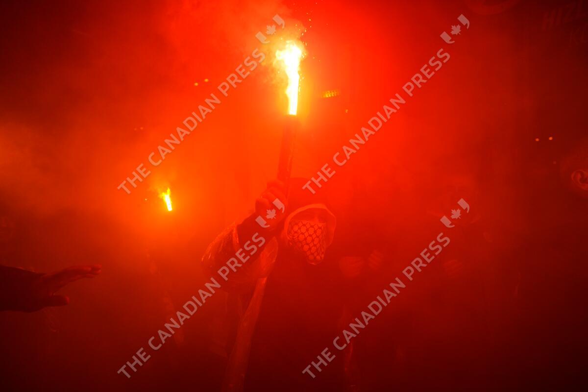 People light flares under heavy rain during a pro-Palestinian protest called by Turkish soccer team supporters outside the Israeli consulate in Istanbul, Saturday, Nov. 18, 2023. Turkish soccer fans from Besiktas, Galatasaray, Fenerbahce and Trabzonspor gathered to show support to Palestinians, calling for an end to Israel's offensive in Gaza. (AP Photo/Emrah Gurel)