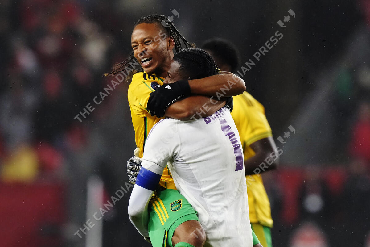 Jamaica's Bobby Reid (left) celebrates after defeating Canada with goalkeeper Andre Blake in CONCACAF Nations League quarterfinal soccer action in Toronto on Tuesday, November 21, 2023. THE CANADIAN PRESS/Chris Young