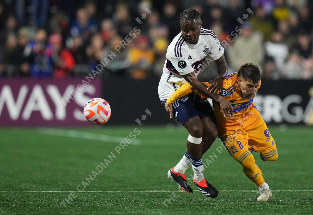 Vancouver Whitecaps' Javain Brown, left, and Tigres UANL's Fernando Gorriaran vie for the ball during the second half of a CONCACAF Champions Cup soccer match, in Langford, B.C., on Wednesday, February 7, 2024. THE CANADIAN PRESS/Darryl Dyck