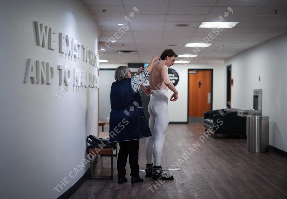 A seamstress works on a costume being worn by a member of the National Ballet of Ukraine during an intermission at a performance of "Nadiya Ukraine" (Hope for Ukraine) on their opening night in Vancouver, on Monday, February 5, 2024. Twenty-three dancers are on a Canadian tour highlighting Ukrainian culture through traditional dance while also supporting the war effort by collecting donations from the audience for Ukraine First Lady Olena Zelenska's Foundation and Humanite. THE CANADIAN PRESS/Darryl Dyck