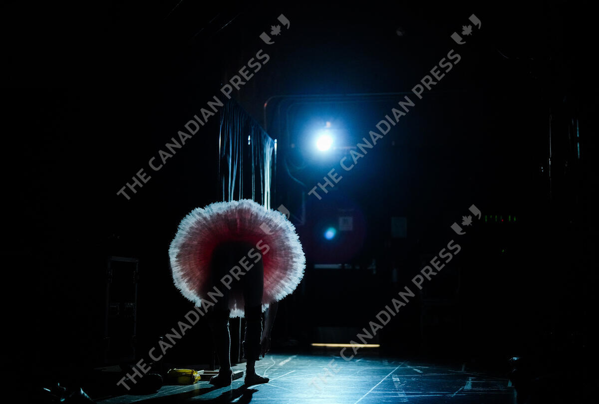 A member of the National Ballet of Ukraine prepares for a performance of "Nadiya Ukraine" (Hope for Ukraine) on opening night in Vancouver, on Monday, February 5, 2024. Twenty-three dancers are on a Canadian tour highlighting Ukrainian culture through traditional dance while also supporting the war effort by collecting donations from the audience for Ukraine First Lady Olena Zelenska's Foundation and Humanite. THE CANADIAN PRESS/Darryl Dyck