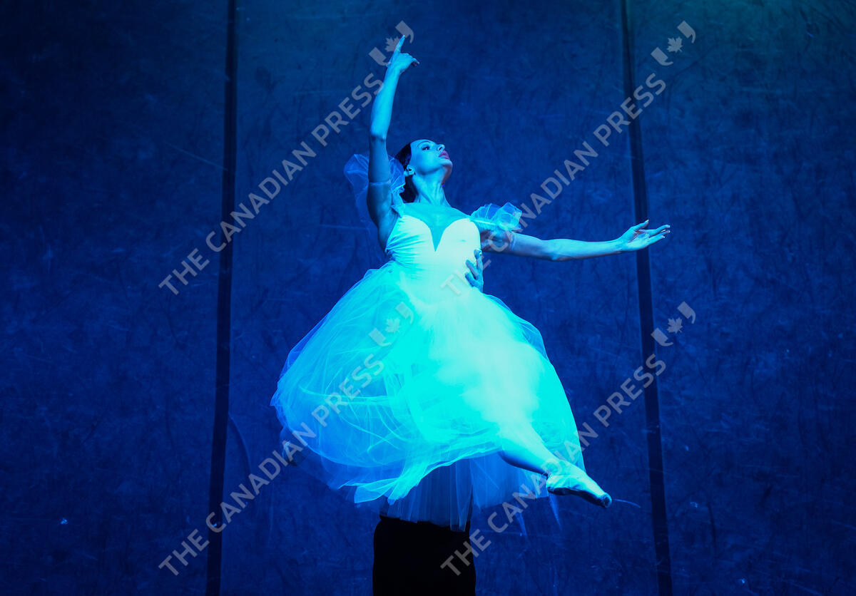 Members of the National Ballet of Ukraine dance during a performance of "Nadiya Ukraine" (Hope for Ukraine) on their opening night in Vancouver, on Monday, February 5, 2024. Twenty-three dancers are on a Canadian tour highlighting Ukrainian culture through traditional dance while also supporting the war effort by collecting donations from the audience for Ukraine First Lady Olena Zelenska's Foundation and Humanite. THE CANADIAN PRESS/Darryl Dyck