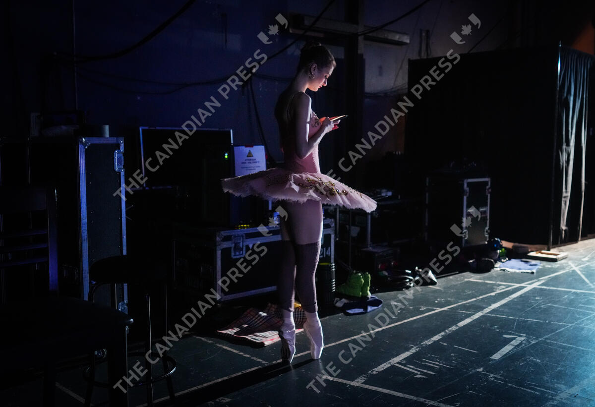 A member of the National Ballet of Ukraine looks at her phone as she prepares for a performance of "Nadiya Ukraine" (Hope for Ukraine) on opening night in Vancouver, on Monday, February 5, 2024. Twenty-three dancers are on a Canadian tour highlighting Ukrainian culture through traditional dance while also supporting the war effort by collecting donations from the audience for Ukraine First Lady Olena Zelenska's Foundation and Humanite. THE CANADIAN PRESS/Darryl Dyck