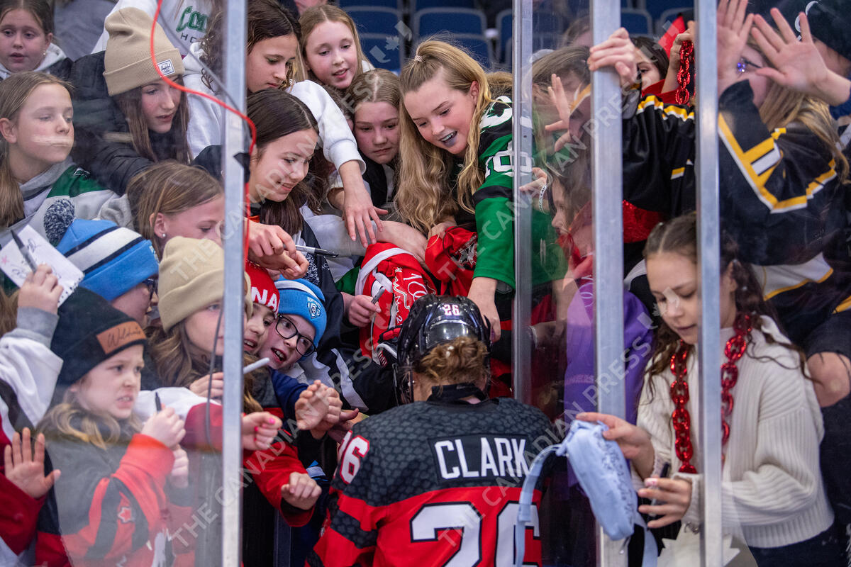 Canada's Emily ClarkÊ(26) interacts with fans after Canada defeated the United States in Rivalry Series women's hockey action in Saskatoon, Wednesday, February 7, 2024. THE CANADIAN PRESS/Liam Richards