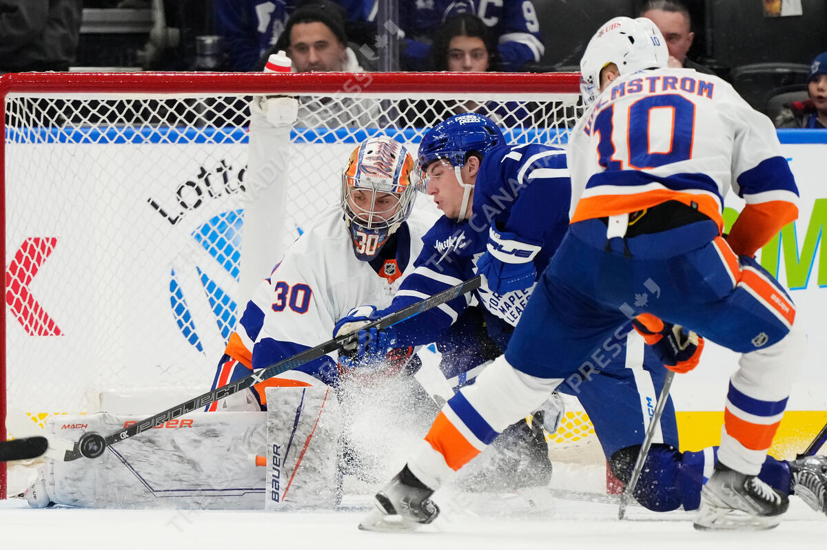 New York Islanders goaltender Ilya Sorokin (30) makes a save on Toronto Maple Leafs' Mitchell Marner (16) as Islanders' Simon Holmstrom (10) defends during third period NHL hockey action in Toronto on Monday, February 5, 2024. THE CANADIAN PRESS/Frank Gunn