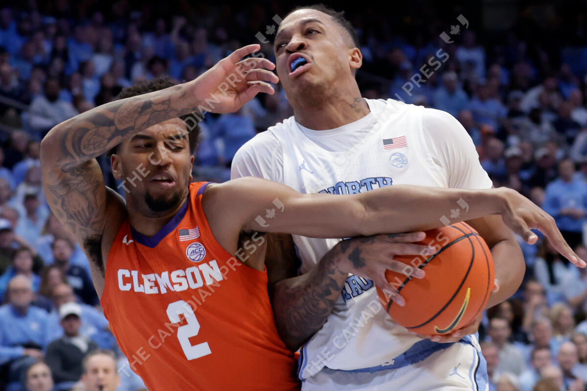Clemson guard Dillon Hunter (2) defends against North Carolina forward Armando Bacot during the first half of an NCAA college basketball game Tuesday, Feb. 6, 2024, in Chapel Hill, N.C. (AP Photo/Chris Seward)