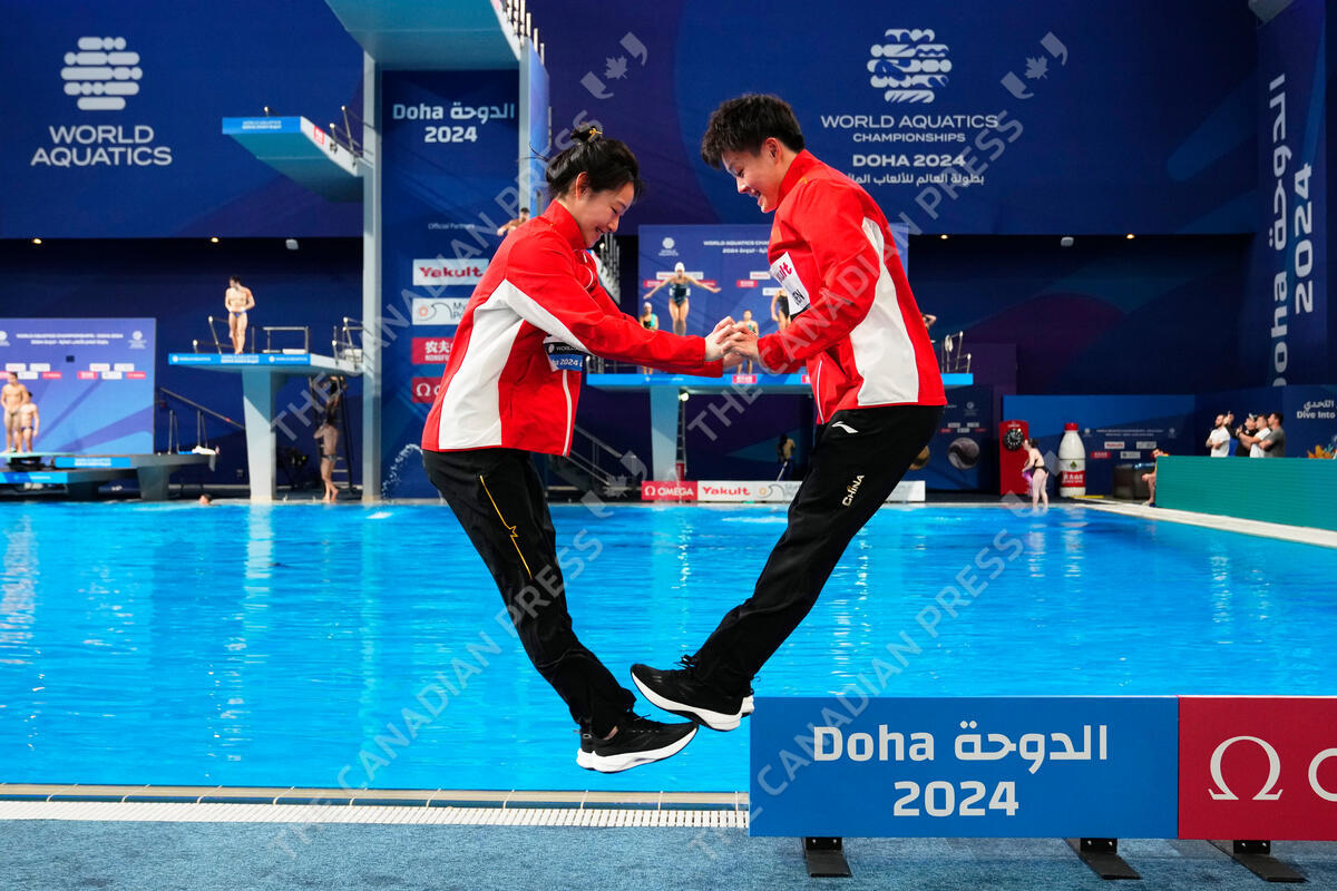 Yani Chang and Yiwen Chen of China celebrate after winning the women's synchronized 3m springboard diving final at the World Aquatics Championships in Doha, Qatar, Wednesday, Feb. 7, 2024. (AP Photo/Hassan Ammar)